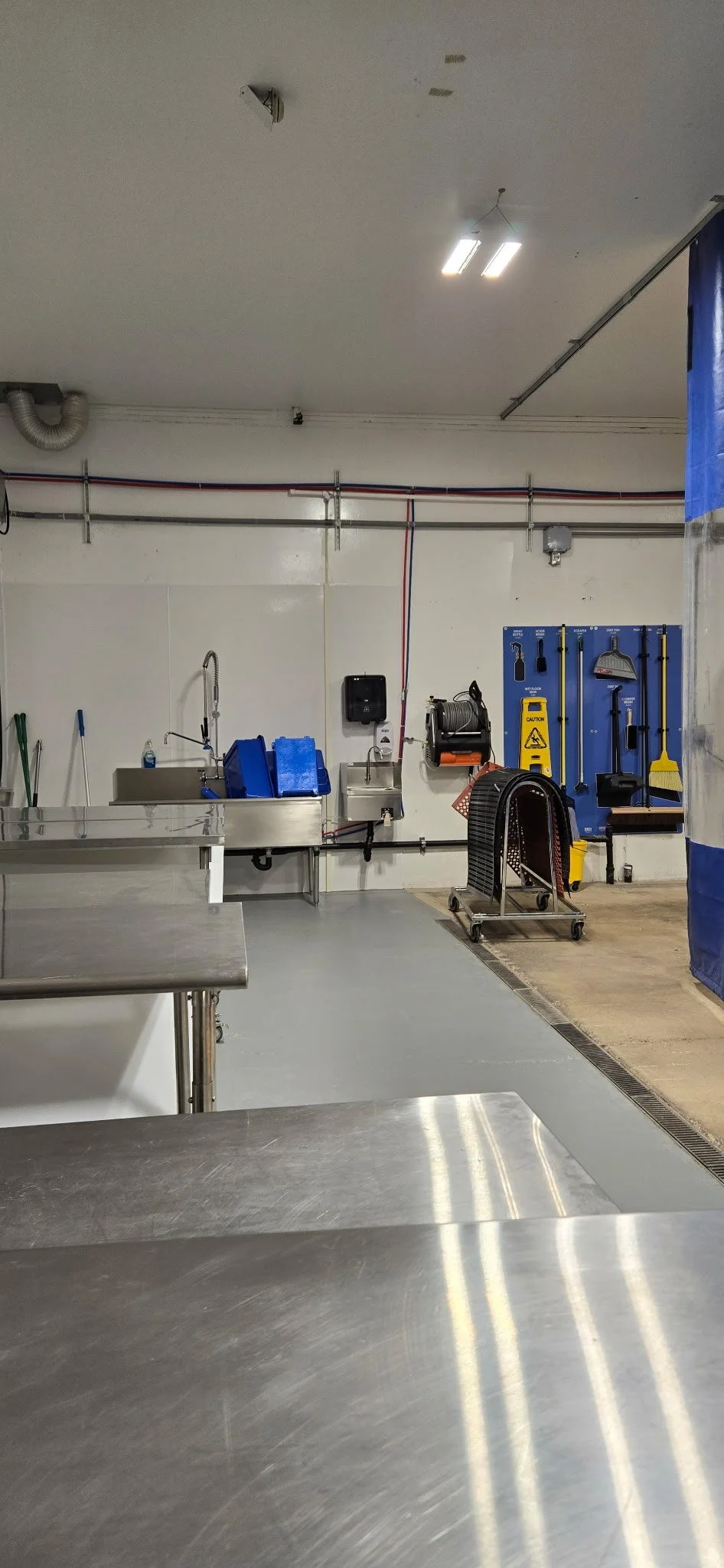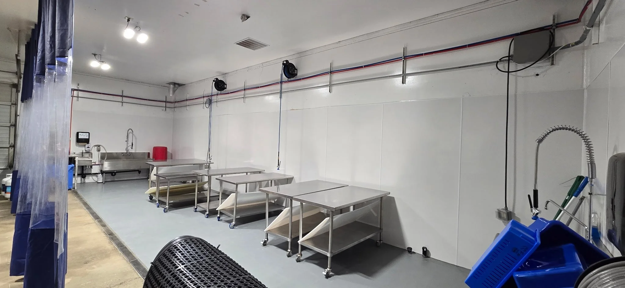 Curtained area with floor drains for fish filleting and other seafood processing. Blast freezer, vacuum packer, and other tools and equipment are available for rent.